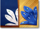 本の「縦幅 x (横幅 + 本の厚さ)」(単行本のブックカバーなら、縦15cm x 横23cm(本の厚さを含む))サイズの長方形の型紙を作りましょう。この型紙を下布の上におき、型紙から縫い代分の1〜1.5cm外側にチャコペンで線 を引き、カッティングしましょう。今回使用するアップリケ・デザインは、「神聖な葉」という意味がある「ティーリーフ」。型紙がデザインの1/4なので、 下布・アップリケ生地と共に四つ折りにしてアイロンを掛け、縦横に折り目をつけます。