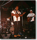 日付もかわって12時半頃、しばらく引っ込んでいた彼らが三たび舞台に出てきました。私はひそかにデジカメを持参していたのですが、その時点で、彼らの姿は遠くから2、3枚しかとれていませんでした。写真を撮るのは失礼な気がしたのと同時に、演奏に夢中ですっかりシャッターチャンスを逃してしまっていたのです。T君に写真を撮るなら今が最後のチャンスだとけしかけられ、私は勇気を振り絞って舞台のまん前に出て行きました。トロイにちょっと目礼してから、シャッターを押したのですが、そのときトロイはなんとにっこり笑って、シャカをしてくれたのです(写真)。I君ではありませんが「もう死んでもいいよ〜」って気分で、嬉しくて、楽しくて、顔がにやけるやら、泣けてくるやら。とにかく、とても粋で、格好良くて、気の良いおやじ達なのでした。