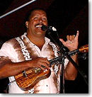 写真のとおり、トロイはでっかいおやじなのですが、ウクレレソロは鳥肌が立つほど繊細で、一つ一つの音がビンビンときわだって聞えました。あんな大きな手で、良く引っかからないものだと思うのですが(彼のウクレレはコンサートタイプ)、彼の手はフレットの上をハチドリのようにすばやく移動し、心地よい響きを奏でるのでした。私達3人はもう舞台に釘付け、足を支点に前30度くらいに傾き、口をあけ、目をうるうるさせながら舞台をただただ見続けるのみでした。が、ライブ自体は非常にカジュアルで、メインランドからの観光客とおぼしき白人達が舞台前で踊ったり(ちょっと邪魔だったんだけどー)、お洒落にきめこんだロコのカップル達が舞台に合図を送ったり、と何だかフレンドリーなのんきな気分で進むのでした。さすが、ハワイ。舞台上からは、Chinoが私達にも話し掛けてくれ、目をハートにしながらトークをきめるT君の姿も。