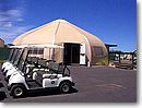 9時30分に出発した飛行機は10時過ぎに着いてレンタカーをピックアップし、目指すはコナサイドにある「ビッグアイランド・カントリークラブ」。総勢12人、バンを借りての民族大移動です。ゴルフ場は空港から山へ向かってひたすら走り続け・・信号がないので・・ひたすら走り続けるって感じです。30分ほどビュンビュン走りゴルフ場へ着くと、え? えぇっ? て感じのクラブハウス(写真上)。