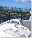 このところ、ハワイは暑い! 日本の夏みたいにムシムシして、朝、暑さのあまり目がさめてしまった。めずらしい…。私の部屋は33階にあって普段は風が強くて大変なのに、このところシーンとしている。というわけで、それを利用して、普段は風が強くて出られないラナイにでて、新聞を読んだり、コーヒーを飲んだり、勉強したりした。あー!!! いいきもち。うちのラナイからはワイキキの海、それからダイアモンドヘッドを挟んでむこう側にハワイカイ方面の海がずーっとひろがっていて、日によっては遠くの方に、モロカイ島、ラナイ島がぼんやり見えるのだ。絶景! こんな景色を眺めながら…、考えてみるとなんて贅沢なんでしょうか! 夜はまた夜景がきれいなんだ、これが!(ちょっと自慢)ハワイは法律でネオンが禁止されていて、街灯の色が一つに統一されているので、東京やNYや香港の夜景みたいに派手さはないんだけど、シンプルなクリスマスツリーみたいで、なかなかよいのです。