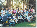さあ、張りきって参加した初回のクラス。そこに待ち受けていたのは、若き独身男性のインストラクターのゲイブと、年齢の似通った3人のロコママ達。参加前は「10組くらいの親子に女性インストラクター1人ってとこかな?」と勝手なイメージを膨らませていたので、ちょっと以外な展開でした。でも、これが幸いし、ゲイブは4人のママ達の遠慮ないリクエストに答え(なんせ自分より若い男性には言いやすいでしょ?!)、産後に適した濃い内容のメニューを考案してくれ、全員が大満足するセッションとなりました。また、ママ同士もすっかり仲良くなったセッションの終わりの頃には、土曜の朝に公園でウォーキング・エクササイズをするまでに発展したのです。ゲイブも都合がつく限り愛犬とガールフレンドを連れて参加してくれ、腹筋などのエクササイズの指導をしてくれました。春期セッション以降は、参加親子もかなり増え、わたしも本腰を入れて週2回通い始めました。引き続き自発的に続けていた土曜ウォーキングは、7〜8台ものバギーが列をなしてカピオラニ公園やアラモアナ公園をゾロゾロ歩く姿が目を引いたのか、なんとホノルルの大手地元紙スター・ブリテンに取材を受け、ついには新聞記事になってしまったのです(でも残念なことに、わたしの日本への里帰り中の出来事だったんですけどね…)!