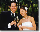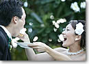 一方、トッド君の番がきたその時、彼のお友だちから「そのまま食べさせちゃえ!」という声が上がりました。残りのケーキのかけらはまだ大きいまま… どうしようか、と一瞬迷ったけれど、そのままトッド君の口へ押し込みました! 周りからがドッと笑いが起きて、楽しいひとときになりました。 次はブーケ・トス。10人程の独身女性の中から、見事ブーケを勝ち取ったのは私のいとこでした。そして、ファーストダンス。二人の思い出の曲「クレイジー」を噴水の前で踊ったのは、「ちょっと、恥ずかしかったなぁ」。最後に、トッド君と私、そしてお互いの家族のスピーチ。次ぎに、フェイバーをゲストに配りました。その間、センターピース(各テーブルに飾っていたお花のアレンジメント)の抽選会(ラッフル)がテッドさんによって同時進行。最初に配ったカードに通し番号を付けていて、当たった人にプレゼントという訳です。 そうそう、一つサプライズな出来事がありました。それは、日本のお友だちが会場にメッセージカードつきのフラワー・アレンジメントを送ってくれたのです! 思いもよらなかったので、涙が出るくらい感動しました。結婚式を通して涙が出たのは、このときが最初で最後でした。 |