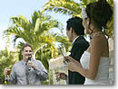 このときからDJにも入ってもらい、バック・グランド・ミュージックも始まりました。DJは司会者のマイクを用意したり、音楽をコーディネートしたりと、音響関係を担当します。実はこのバック・グランド・ミュージック、トッド君と私で全ての曲を選んだのです。約3時間分の音楽を考える作業はとても大変でしたが、「よく頑張ったなぁ」と、終わった今ではいい思い出です。 ゲストは、パーティーが始まる前に受付を済ませます。受付ではゲストブックに名前や住所を記入し、ウェディング・ギフトを渡します。受付からは、テーブル名の書かれたカードを各ゲストに手渡します。テーブル名は番号ではなく、プルメリア、ハイビスカス、ピカケ、イリマなど、ハワイのお花の名前をつけました。ちょっとした私のこだわりです。 |