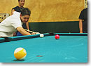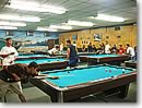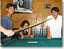 5ゲーム目、今度は私のブレイクで始めます。ところが、ブレイクで何も入れることができなかったため、エイドリアンに交代。すると、彼も、「負けてなるものか!」という気迫でボールを次々に入れていきました。4ゲーム目と同じ展開で、1番から7番を落としていきます。そして、8番と9番がさっきと同じような位置に並び、誰もが、「もう2度と同じ失敗はしないだろう。」と思った瞬間、あろうことか、彼は8番をまたもや外してしまったのです。向こうのチームからはため息が聞こえてきましたが、外した本人が一番悔しいんですよね、こういう場合。実際、エイドリアンはキューの下の方を床に何度も撞きながら、「ジャーンク!」と叫んでました。「ジャンク(junk)」とは、元々「くず、がらくた、価値のない」などの意味ですが、そこから派生したスラングとしてロコの若者達はよく使います。「だめな、良くない」などの意味で使っていることが多いようです。日本語でも「ジャンク・メール」、「ジャンク・フード」って言いますよね? それと同じです。エイドリアンもうまく入れられなかった自分に対して、「だめだー!」と叫んだんでしょう。悔しがる彼の姿を横目に、8番をさらっとポケットに入れてまた勝負を決め、3対2の接戦でようやく勝負をものにしました。 嬉しさのあまり、みんなのところに駆け寄ると、「だめだよ、ちゃんと挨拶してこないと!」と注意されました。そう、やはりスポーツは、「礼に始まり、礼に終わる」ですよね。慌ててエイドリアンのところに行き、手を差し出すと、「グッド・ゲーム!」と言ってくれました。ハンディキャップが功を奏して、無事、チームの「シークレット・ウェポン」となることができた瞬間なのでした。 ●ゲームのタブー ●ベルベット 14台のプールテーブルがあるビリヤード場。曜日により、割引特典あり |