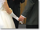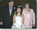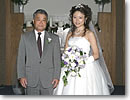 ●緊張のウェディング 挙式当日は、恐ろしく早く起きて、ヘアメークをしてもらいました。メークは、余りの化粧の濃さに驚きながらも、「写真に撮れば、分からない」となだめられつつ、ド派手な花嫁姿に変身したのです。時間になり、父の腕を組みながら、バージンロードを一歩ずつ、後ろ向きで待っている主人に近づいて行くのですが、緊張とともに湧き上がってきた感情は、「やっと、ここまできた」という感動と、「これからがスタートだ」という新たな決意でした。アメリカの結婚式の伝統をもう一つ。新郎は、結婚式の当日、誓いを立てる場所に新婦が登場するまで、新婦のウェディングドレス姿を見てはなりません。私たちも一応その伝統に則って、当日の準備は別々に、そしてバージンロードを歩む私と父に対しても、主人は後ろ向きで待っていたのです。リハーサルの通り、父が主人の手と私の手を取り、「おめでとう。よろしくね」と言いながら、2人の手をつなぐのですが、照れ屋の父にしては上出来だった、と褒めてあげたいです。 |