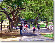 ●UHって? すっかり前置きが長くなってしまってすみません。えーと、UHに話を戻しまして、UHとはハワイ唯一の州立大学グループの総称で、私が通っているのが本校のマノア校、他にはヒロ校とウェストオアフ校の4年制大学、加えて7校のコミュニティカレッジ(ハワイ、ホノルル、カピオラニ、リーワード、ウィンドワード、マウイ、カウアイ)で構成されています。全10校からなるマンモス大学(死語?)で、総学生数は50, 569人、うち大学院生は6, 404人です。留学生は全体の5%程、日本人留学生は約500人と留学生の中では一番多くなっています。でも、私の専攻がマニアックだからか、未だ1人の日本人の人とも同じクラスになったことがないんですよね、淋しーっ。