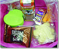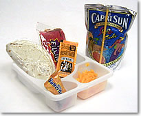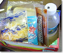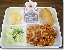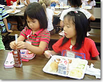 じゃあハワイではどんな給食風景が繰り広げられているのか、カフェテリアのある一日をレポートしてみます。この日のメニューは、ベイクド・マカロニ、サラダ、フルーツ、パン、ミルク。ちなみにこれは、ちいちゃんは○(マル)、お姉ちゃんは×(バツ)のメニューです。約80%の子供が給食でしたが、残りの子供達がどんなものを食べているのか、気になりますよね? 辺りを見回したところ、まずダントツに多かったのが「ランチャブル」。ランチャブルとは箱入りの子供用既成品ランチ。何ともアメリカンなデザインの箱の中には、クラッカー、ハム、チーズ、ジュース、キャンディ・バーが詰め合わせてあり、約3ドル。栄養価的には? ですが、素早くスナック感覚で食べられるのがアメリカのお子チャマには大うけ。親も楽チンで、お弁当には不動の地位を誇ります。 |