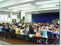 以前このシステムを日本の小学校で説明したところ、先生から「日によって数が上下するのに、どうやって必要な食材を事前に確保できるのか?」という、ごもっともな突っ込みが… たいてい見込みで調理しているようですが、概算が外れて主食のソーセージが足りず、最後にカフェテリアに来た学年の給食が遅配されたといったハプニングもありましたね。校長先生は怒りまくってたけど、でもそこはハワイアン! 給食センターの「足りないモンは仕方がない。少々お待ちを〜!」の一言で、飢えたる子供達はひたすら待つのみ! |