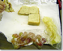ピーナッツバターとジャムの重ね塗りサンドにぶどう、チップスをジップロックにつめた標準的なアメリカン弁当 |