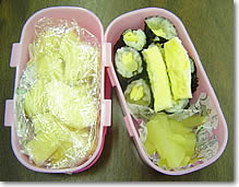 ![]() 韓国式のり巻きと玉子焼き、フルーツ。韓国のオンマの愛情弁当です |