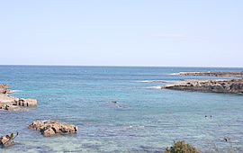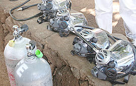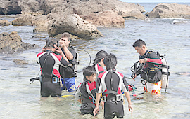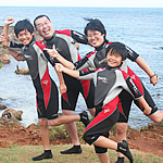 ププケア・ビーチの駐車場では、アウトドア・ハワイのダイビング・インストラクターのジェフさんが待っていました。 早速家族全員、赤とグレーのウェットスーツを着込みます。 「まるで、ウルトラマン家族やな〜」とお父さん。お父さん、お年がバレまっせ〜。 トモさんから、ダイビング時の注意を丁寧に説明してもらって、腰に錘をつけいざ出陣。 北米でも初めてといわれる、新型ダイビングにチャレンジです。このダイビングが画期的なのは、タンクを背負う必要がないということ。顔全体をピッタリと覆うマスクからは長いホースが伸びていて、ホースの先にはタンクを積んだ小さなボートがあります。つまりボートと一緒に動きながら、ホースの長さの範囲で海に潜ることが出来るんです。グループで一緒に潜るので、これなら小さな子供でも安心ですよね。 さあ、次はお父さんが待ちに待った飛び降りです! ああっ、お父さん、そんなところから大丈夫ですか〜っ! |
