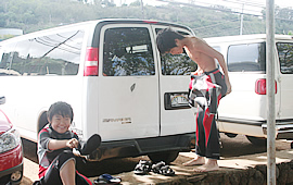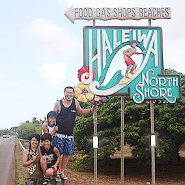 元気一杯の足立さんご一家とサワヤカ海の男のトモさんと一緒のノースショア取材は、編集部にとってもとっても楽しいものでした。「何でもします!」と力強く答えてくださったお母さん淳子さんの言葉どおり、「ここでジャンプしてください」、「感想をひとこと」、「ガッツポーズ(死語?)をお願いします」などなど、編集部の無理なお願いにも、ニコニコ笑顔で答えてくださり、編集部一同感激でしたよ。ワイキキを出発したときは、空には雲が広がり今にも雨粒が落ちてきそうだったのに、だんだん晴れてきて、ノースショアに着いた時にはドピーカン! 足立さんご一家の明るさが天気まで変えてしまったようです。ハワイの海を遊びつくすこの企画、次回もお楽しみに〜。(編集部:明子)