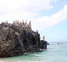 ●ワイメアビーチで、男らしく大ジャンプのお父さん、続いてお兄ちゃんも! アロハ! みなさんのハワイで叶えたい夢の実現をお手伝いしている、ハワイの歩き方2代目イメージモデルのサムです。今回は、おもろ明るい足立ファミリーの大冒険ツアーの第2話をお届けします。前回はシャークス・コーブで新型ダイビングに挑戦した足立ファミリー。頼もしい海の男、「アウトドア・ハワイ」のトモさんの案内で、岩飛び込みに挑戦することに。高いところが大好きなお父さん、思わず武者震いです。 やってきたのは、ワイメア・ビーチ。ビーチの端には大岩があって、ローカルの子供たちの間では、飛び込みのメッカとしてよく知られています。近付いてみると「お〜いるいる!」。たくさんの人々が岩の上で飛び込む順番を待っています。