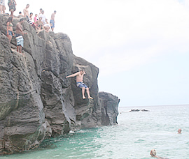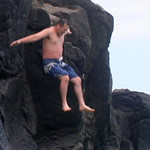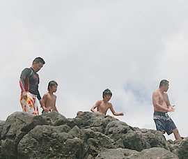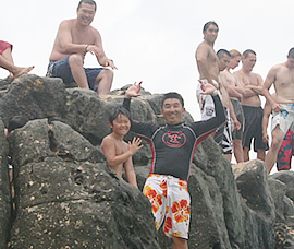 「やるぞ〜!」 「がんばれ〜」と、心配そうに下から応援するお母さん。 岩の上にずらりと並ぶ若い男の子立ちの後ろに続く一行。岩の上から眺めると案外高くで思わず腰が引けてしまいそう! こわがる子供たちを励ますために、まずはトモさんが大ジャンプ! 「よーし」と、次にはお父さんが大ジャンプ。何と岩の一番高い、上級者ポイントから挑戦です。