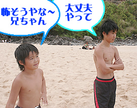 ワイメア・ビーチの大岩には、高い場所、次に高い場所、それほど高くない場所と、幾つかの飛び降りスポットがあるんですけど、さすが高い場所が好きな足立一家のお父さん、迷わずまっしぐらに一番高いスポットに行かれたのには驚きました。地元の人々でも、飛び込むのにいくらかの逡巡を見せているというのに、足立お父さんときたら、スススッと前に進んだと思うと、ピョンッと気軽に飛ばれたのはお見事! 思わず取材を忘れて大拍手をしてしまいました。オーストラリアでは、大バンジーに何の迷いもなくチャレンジして、「あり得ない日本人!」と言われたことがあるという足立おとうさん。ハワイでもその実力を見せてくださいました! いやーびっくりしたな〜。(編集部:明子)