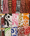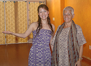 ●ラバラバ初体験、そして、サプライズ! お店のスタッフのロビンさん、とっても笑顔が素敵なんです! ラバラバの色んな着かたを手取り足取り教えてくださいました。バングルを使うとより簡単に着れるし、アクセントにもなりますね。それにドレスやスカートだけでなく、ベストにもなったりするのにはびっくりです! こんなに習ったけど、大丈夫かしら… 必死に覚えようとしていると、お店に他のお客様が… と思っていたら「ノアノア」のデザイナーのジョーンさんでした!!! 去年、幸運にもお店でお会いする機会があったので覚えていますとも! そして、なんと、感動している私にぴったりの藤色のパンの木の柄のラバラバをプレゼントしてくださいました!