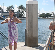 さらに、ジョーンさんが、「みゆきと一緒に特別な時間を過ごしたい」とおっしゃって、豪華なヨットがいっぱい並ぶハーバーへ連れていってくださったのです! 買い物に追われていた私は、今回、初めてハワイの海を見る事ができました。緊張とサプライズとで大忙しだった私の心は、海風に吹かれているうちに落ち着き、優雅な時の流れを感じるまでになりました。まさかお会いできるとは思っていなかったので、お店の人にことづてようとしていたお土産を渡すことに。うちの家業が京都のラメ糸屋さんなのです。その糸で作ったスカーフをジョーンさんにお渡ししたら、とっても喜んで頂いて逆サプライズ?!