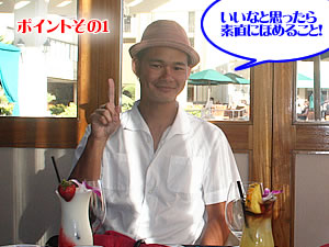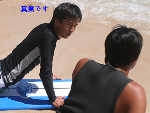 ●ケンタロウ・コーチ登場!典型的なアラサー(30歳前後)の日本男児、JAPAN君をモデルに、ここハワイでモテる男について研究中のハワイの歩き方編集部。前々回にはファッション、前回は美容と、ハワイでのモテ・ルックスを学びました。 「JAPAN君、素敵になったわよ。じゃあ、頑張ってね〜♪」 ファッション・コーチのデリックさん、爽やかに去っていきました。どうもありがとうございました〜。 続いてやって来たのが実践コーチのケンタロウさん。「日本人なのにポジティブにモテている男子がいる」と聞いて、さっそくスカウトしたのがケンタロウさん。サーファーでクラブでDJもこなす、素敵男子です。実は元歯医者さんでMBA(経営学修士号)も持ってるという多才な人なのです。 「こんにちは〜♪」 颯爽とあらわれたケンタロウ・コーチ。よろしくお願いします! と、JAPAN君。まずはサーフィン、ということで、プアレイラニ・アトリウム・ショップスの2階、ファンクション・サーフでサーフィン用のウェアを調達です。うん、なかなかサマになってますよ! ●ドキドキ、初サーフィン! パドリングしながら海へ。見る見る2人の影が小さくなっていきます。大丈夫かな? サーフボードの上に座って波を待ちます。おっ、ほどよい波が…ケンタロウさん、素早くサーフボードに立つとススーッと波に乗りました。 「おーっ、かっこいいーっ!」 遠く豆粒のような人影をカメラのレンズで必至で追います。しばらくすると、突然…立った! JAPAN君がボードに立って波に乗ってます。初日なのにすごいじゃないですか。パチパチ。しばらくして海から上がってきた2人、ほどよい疲労と満足感が現れた良い表情です。なるほど〜、サーファーがモテる理由がちょっとわかったような気がしました。