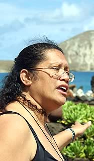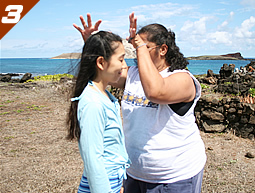 ハワイの聖地(パワースポット)での礼儀作法を正式に学んだことはないので、「お清めにお塩でもいるかしら?」ととりあえず天然塩を持ってきたものの、何をどうお供えするかわかりません。そんな気持ちを察してか、レイフルマノさんは続けます。「ハワイアンの神殿にお参りするときにお供物をお供えする人がいますが、大自然の神々はそれを喜んではいるけれど、『持って来た物は全て持ち帰って欲しい』、と言っています。ですから、お供えは持ってきても帰る時に置いていってはいけませんね」。 神殿に入る前に、ハワイの自然の神々に敬意を表して目礼します。レイフルマノさんによると、「聖地に入る前には、『入ってもよろしいでしょうか?』と心の中で大自然に許可を求め、敬意を払うことが大切です」。さっき海から持って来た石を持って、「あのときの心の痛みを癒したい…」と念じながら石の輪の中に入りました。なんでも、この石を神殿の中に入れると、後で石が自然に海に戻るという伝説があるのだそう。「何百年かしたら、確かに海に戻るだろうなあ…」なんて思いながら、この石を神殿の中に置きました。 |