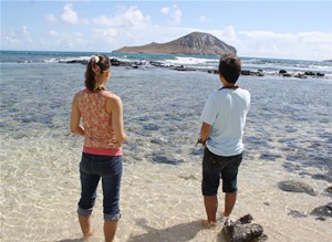 次のパワースポットはオアフ東海岸にあるマカプウ岬、古代のハワイの神々が飛び立つ際にパワーを置いていったと伝えられる土地で地球のエネルギーを感じます。ヒーリング・プールとも言われるマカプウの海は病気を治すとも言われており、フラダンサーたちは、この海水でお祈りしてお清めをしてから踊りに行くのだそうです。ここで私たちは、海水に足をつけてラビッドアイランド(ウサギ島)の方向を向いてヒーリング・パワーをもらいました。