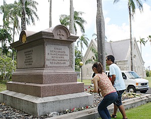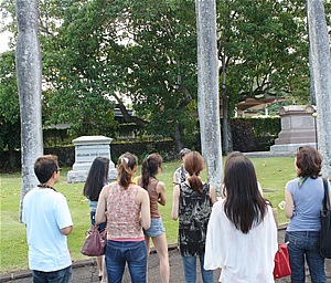 前編に続いて、私たちが4番目に訪れたのは、このヒーリング巡礼ツアーの最も重要ポイントといえる場所、マウナ・アラ。ロイヤル・モザリウムとも呼ばれるこの土地は、ハワイの王室が眠る霊廟であり、ハワイで唯一純粋なハワイアンの土地です。その証拠に敷地内には、通常ハワイの公共の場所に掲げてある星条旗はなく、ハワイ州旗のみ掲げてあります。このツアーがなぜこの場所に立ち寄るかというと、ハワイアンの王族にお参りをすることで、この後に私たちが訪れるハワイアンの聖地(ヘイアウ)へ行く際のマナーを学び、入場の許しを得るためなのです。