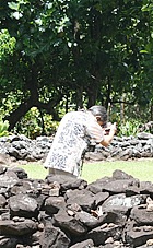 余談ですが、今回の取材に同行したハワイの歩き方のカメラマンAさんが、以前別のヘイアウへ行った際に何も知らずにはしゃいでしまったらしく、その後一緒に行った人それぞれに悪いことが起きたそうなのです。それで今回ガイドさんが彼女のためにここで特別にお祓いをしてくださったのですが(*注:通常は、このツアーにお祓いはありません)、なんとその最中にヘイアウに積んであった石が突然崩れる、という不思議な現象のハプニングもありました。ヘイアウに行く際には、皆さんもきちんとマナーを守ってね。 |