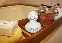 アフタヌーン・ティーにかなり満足し、次はお部屋を拝見することにしました。このお部屋は最近リニューアルされたそうで、インテリアにも凝っていて、お洒落だけれどなぜか自分の家にいるようなホッとする空間を醸し出しています。アメニティも充実していて、コーヒーや紅茶などの飲み物はもちろん、スリッパやバスローブ、ボディ・ローションなども揃っています。そして、私が一番感動したのはバスルームに置いてあった、ザ・カハラ・ホテル&リゾートのロゴ入りのアヒルのおもちゃ(写真右下)。これはここでしか手に入らない物で、宿泊者以外でも購入できるのでお土産にいいですね。