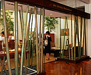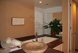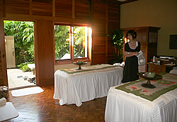 | それと、もうひとつ忘れてはいけないのが気になるエステ。今回は実際にエステを受けることはできなかったのですが、せっかくなので見学だけさせてもらいました。受付を済ませ、ジャングルのような細い通路を歩いていくと、突然変わった顔のお面が目に飛び込んできます。そこが、エステを受けるお部屋の入り口なんですよ。お部屋に入ると、マッサージ用のクリームやタオルなどがセンス良く置いてあり、一見アジアン・リゾートを思わせるようなインテリアになっています。ベットが二つ並べられたプライベートルームには、打たせ湯が付いたお風呂があり、エステの後にゆっくりとつかることもできます。受付には、実際にエステで使われているボディクリームやローション、お茶などが販売されていてエステを受けていない人でも買うことができます。この「ザ・カハラ・ホテル&リゾート」は、ワイキキから車で10分くらいと近いのに、意外と日本人観光客が少なかったですね。