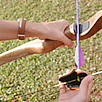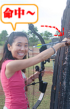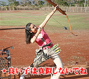 彩子: あれ、意外と的が遠いのね… では、しっかりと背筋を伸ばして立って、こんな感じでいいんですか? うわ、弓を引くのって、カンタンそうに見えてけっこう筋肉使うのね! 狩猟生活をしていた先祖の血でも騒ぐのでしょうか? 弓を射る瞬間ってスカーッとして快感! 的に命中すると、なお嬉しい!
