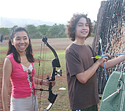 「美少年とアーチェリー」と心躍らせて向かった先は、オアフ島ワイパフにある「ワイピオ・ジェントリー」。アーチェリーができる広い公園があるのです。そこで待っていたのは、アーチェリーのブートキャンプ隊長に名乗り出たジョン・スポンバーグさん。元アメリカ海軍兵で現在は陸軍のレクリエーション・センターのマネージャーです。ジョンさんは、オアフ島在住でアーチェリー歴30年以上。アーチェリーは、腹筋や背筋を鍛え、美しい姿勢をつくるのに最適なスポーツらしいですね。猫背ぎみの私にはピッタリ。ジョンさんの2人の息子さん、スカイラー竜馬君(13才)とハンター海斗君(10才)も一緒です。おお〜〜! ケガレなき美少年たちよ〜。一緒にアーチェリーしよう〜!(怖)