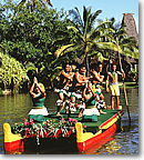 また、絶対に見逃せないのが、流れる川を舞台に2時30分から一日一回だけ上演されるカヌーショー。各島の民俗衣装に身を包んだ若者たちがポリネシアの伝説をベースにしたミュージカル仕立てのショーをカヌーの上で華やかに繰り広げます。
