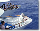 さあ、もう船はダイヤモンドヘッド沖を超え、カハラ・ゴールドコーストをスムーズに走行しています。ナバテック号に乗船しているナチュラリスト(クジラの専門家)が、常時マイクでクジラについての説明をしてくれます(日本語の通訳あり)。そして、クジラが見えたら、船首にむかって時計で何時の方向かをアナウンスしてくれるので、みんなその放送を今か今かと待っている状態。マストの横ではスタッフが常時望遠鏡でクジラをキャッチしようとスタンバイしています。今年はクジラの出足が遅く、先週は5頭に遭遇できただけ… との話にちょっと不安になってきます。その矢先、キャプテンから「船の後尾側、ワイキキ沖に近い方角にクジラの潮吹きが見えました。今から方向転換、そちらへ向かいます。」との心強いアナウンス。乗客もデッキに出てその方向に身を乗り出してクジラとの遭遇を待ちかまえます。