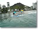 カイマナ・ビーチから海に入り、左手にあるダイヤモンド・ヘッドの方に漕ぎ出したところ。途中、とても浅く、リーフがせり出している場所があるので、パドリングで沖に出るときには注意してください。穏やかな波が来る、初心者向けの場所だと思います。 |