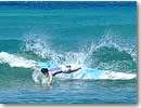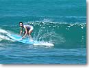 初めに波をキャッチした時、今回教わったロパカ先生が「前! 前!」と叫ぶのです。後で、どういう意味だったか聞くと、「前を見なさい」ということでした。前を見ないとバランスがとれないからか!? と、納得。また、次の波をキャッチすべく、パドリングして沖へ。その途中にも、「前! 前!」という声。今度は、もう少しボードの前の方に体を移しなさい、という意味でした。次の波を待っているとき、「前! 前!」と、また指示を受けたのです。「あれ? ちゃんと真ん中に乗っかっているのに、何だろう?」。波をキャッチした後にも、また、「前! 前!」。「前を向いているのに、どうして?」。私はすっかり頭が混乱していました。時には、「後ろ! 後ろ!」という指示も。「一体、何をどうすれば良いの?」。日本語、ムズカシスギマス!