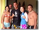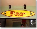 今回のレッスンでは、なんとハンズ・ヒーデマンが直々にレッスンをしてくれました。沖に戻ってくるたびに、丁寧にいろいろなポイントを教えてくれたのです。「人にぶつかるのではないか?」と恐れている私に、「進みたい方向を見ていればいい、人にぶつかると思って人を見ていると、その人に突っ込んでいっちゃうよ」。立ち上がってもバランスが取れない私に、「膝をやわらかくして、衝撃を膝で吸収するんだよ」。うまく波をキャッチできたときには、「怖くなかったでしょ? 楽しかったでしょ?」と。「まだ、どんな波がいい波なのか分からない」という私の質問にも丁寧に説明してくれました。波のブレイクの仕方、力のない波はカールしないで過ぎ去っていくこと。指さしながら、波が盛り上がってくる様子を説明、私も何度も彼と一緒に波を見ているうちに、感覚的に理解できた感じ。パドリング開始のタイミングなどは、自分の体力などとの兼ね合いもあるので、やはり練習と経験で会得するしかないようです。