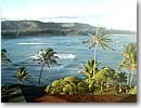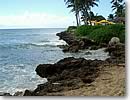 サーフポイント「タートル・ベイ」は、右手に宿泊したタートルベイ・リゾートを望みながら、入り江のようになっている所。まず、ワイキキでのサーフィンと違う点は、砂浜というよりは岩場から海に入ることです。岩と岩の間には勢いよく波が入ってきて、足元もよろけるくらい。もちろん、一人でボードを持ってそこに降りるのは危険だし、「無理!」。コーチに手伝ってもらって、ボードを降ろしました。映画の中で、高い所からサーフボードを持って、飛び込んでいく人を見たことがあるけれど、なんか岩場から入っていくなんて「通」っぽい! となんだか無性にワクワクしてきました。
