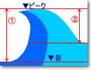 20フィートの波 −波の測り方− ところで、波が20フィートだった、という言い方をしましたが、これは一般的な測り方に基づいた数値。実はハワイ、特にノースショアのサーファー達の間では、波の高さの測り方が違います。言葉の説明だけでは分かりづらいので、右に図を載せました。一般的な計測は、(1)の方です。波の前面から見てボトムラインと、波のピークとの差を波の高さとします。ハワイでは(2)のように、波の背中側(沖の方)から見て、ボトムラインと波のピークとの差を測ります。通常20フィートでも、ハワイの人たちに言わせると、それは10フィートぐらい。彼らが「5フィートの波」と言った時に、「1.5メートルくらいなんだ」とは思わないように! 実際の数値はハワイの2倍ほどになります。「それくらいの波だったら、私も経験したわよ」なんて言ったら、初心者には恐いところに連れて行かれるかもしれませんよ… しっかり、確かめましょうね、それがハワイ式の測り方かどうか…