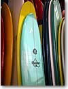 先日、カピオラニ通りにある、Clipsさんにお邪魔して、サーフボードについてお話を伺ってきました。目的は「私に合うサーフボードはどんなものか?」を相談するためです。いざ、サーフボードを買おう! と思っても、結構その種類は豊富で、サーフィンを楽しむスタイルによっても変わってきます。大きく分けて3種類。長い「ロングボード」、短い「ショートボード」そして、ロングボードとショートボードの中間位の「ファインボード」。ロングボードはゆっくりと波を楽しむ、ショートボードはアクティブに波を楽しむ、そしてファインボードはその中間位の楽しみ方で使います。「第4回CAで体当たりサーフレッスン」でも少し触れましたが、波の状態によってもボードは使い分けるそうです。日本ではショートボードを使う人が多いのでしょうか? 初心者はロングボードとよく言われますが、ハワイの大きなゆっくりした波では、上級者でもロングボードでゆっくりと波を楽しんでいる人がたくさんいます。