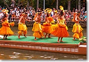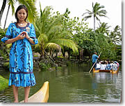 ■カヌーショーと園内ツアーで早くもエキサイト 園内に入園すると、まずは午後2時半から3時までの30分間行われるカヌーショーを見学。サモア、アオテアロア(ニュージーランド)、フィジー、ハワイ、タヒチ、トンガ、マーケサスの7つの村から成り立つPCCですが、その各村のパフォーマンスがそれぞれのカヌー上で行われます。ドラムの音と共に激しくパフォーマンスを繰り広げる村、穏やかなフラを披露するハワイ村など、個性豊かな各村の民族ダンスとパフォーマンスが繰り広げられます。