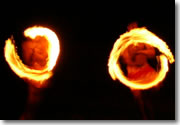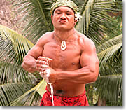カヌーショーが終了すると、日本語スタッフの説明を聞きながらツアーが始ります。今回のツアーでは、まずサモア村を訪問。パフォーマーの各国の言語を交えたユーモアあるパフォーマンスに一気に引き付けられ、まずは火おこしの実演から。原始的に木を使って火をおこし、足で火をもみ消すまでの技に、観客からは一斉にどよめきが沸き起こります。そしてココナッツの硬い皮をむき、石で殻を割り、実からココナッツミルクを搾り出すまでの実演も。最後は7メートルもある「やしの木」を素足で上まで上る技まで披露。運が良ければやしの木からやしの木へ飛び移る神業も披露してくれるかも知れませんよ!? |