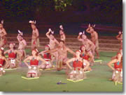 ■本日のメイン・イベント、「ホライズン」ショー PCCに来たからには絶対に見ずには帰れないのが、ハワイで最大規模を誇るイブニングショーの「ホライズン」。午後7時半から約1時間半あるこのショーでは、総勢100名以上もの出演者がカラフルな民族衣装と水、火、煙を効果的に使った本格的な舞台で歌や踊りを披露します。ポリネシアの島ごとのテーマで大きく6つのパートに分かれたショーの前半はハワイ、トンガ、アオテアロアの順で登場。「ハワイ」はしっとりとしたフラのほか、プイリ(竹)やイプ(ひょうたん)を使った踊りで観客を魅了します。「トンガ」は力強い太鼓や、手の動きに重点をおいた踊りが特徴的。強烈な叫び声と共に舞台に出てくる「アオテアロア」は、足や胸をたたきながらワイルドなダンスを見せてくれます。 |