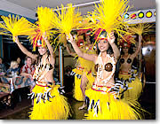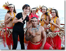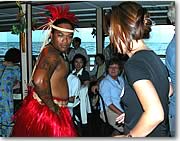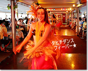 ■言葉が分らなくても、友達になれる! アリイ・カイ号でのひとときは、まさにクロス・カルチャー体験。まず、バスの中から世界各国から来た乗客と友達になってしまうし、船上では英語のアナウンスの次に日本語、韓国語、中国語のアナウンスが流れ、国際色豊か。ライブ音楽もハワイアンあり、エルビス・プレスリーの歌あり、坂本九の歌ありと、いろいろな音楽を楽しめます。また、ダンサーやスタッフの出身地もさまざまで、ここが太平洋のメルティング・ポット(人種のるつぼ)だということを実感させてくれます。