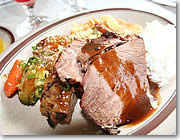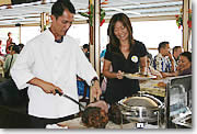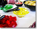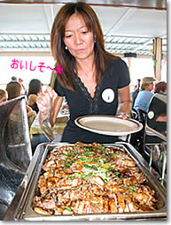 ■船上でのビュッフェはバラエティ豊富 ライブバンドの演奏に耳を傾けながら、トロピカルなドリンクで楽園の海原を楽しんだ後は、お食事の時間。ビュッフェのテーブルには、サラダ、パスタ、チキン、ポテト、お魚、ロースト・ビーフなどバラエティ豊富なメニューが並びます。中でも、特製ロースト・ビーフとグレービー・ソースは、絶品です。デザートのセレクションも、フルーツやケーキ、カラフルでトロピカルなフルーツ味のゼリーなどが盛りだくさん。しっかり食べて、ダンスタイムに備えるのだ! |