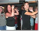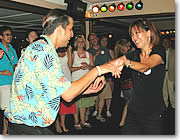 ■ダンスは、楽しんだものが勝ち! 最後は、全員参加のダンスタイム。ここからが本格的なパーティ・タイムです! 「ちょっと恥ずかしい」なんて言ってる場合ではありません。こういう時は、楽しんだもん勝ちなのです。しかも、この船では、ステージがテーブル席の中央にある通路に設けられていて、壇上にあがる気恥ずかしさもなく、ほんの一歩、席を立つだけで気軽に輪の中に入れるのです。気がつけば、私も見知らぬ外国人と手をつなぎ、見よう見まねのステップで汗をかき、ライトに照らされ、足を踏まれながらもゲラゲラ笑い、我を忘れて夢中になって楽しんでしまいました。今までは、こういう場所ではノリノリの人たちをどちらかと言えば冷めた目で見ていた私。でも、今回は迎えのバスの中から始まるスタッフの盛り上げに自然に乗せられてしまった感じです。 |