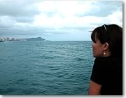 ■「もう、日本に帰りたくな〜い」 船上から、水平線上にあるダイヤモンド・ヘッドを見つめながら、物思いに耽る私。ハワイで出会った人たちとの思い出、おいしいレストラン、そして美しい海。ハワイのすべてが心の中に焼きついて、これからハワイなしで生きていけるかどうか… ずっとずっと、こんなに素敵な時間が続けばいいのに。実は、明日は一時帰国のため日本に帰らなければならない日なんです。「もう、日本に帰りたくな〜い!!」 。 でも、ハワイでの最後の夜を海の上で、こんな風に過ごせるなんて、とっても幸せ。 |