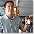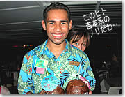 写真入りキーホルダー クルーズ中に、船上で撮った写真を加工して、その場でアリイ・カイ号のロゴ入りの特製キーホルダーを作ってくれます。右の写真のベン・アフレック似のイケメンは、フォトグラファー兼キーホルダー製作担当クルーのランディ君。ハワイの船上の思い出を世界で1つしかないキーホルダーにして、1個$12で販売してくれます。 「ランディ君、キレイに撮ってね!」