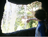 ■海に山にと移り変わる風景でトロピカル気分満喫! まず、私たちの目に飛び込んできたのは、サンゴ礁の影から姿を覗かせているのは鮮やかなブルーとオレンジ色の大きな熱帯魚のオブジェ! ワクワクと期待に胸を膨らませながらサンゴ礁の橋を渡ると、そこにはもうトロピカル・アイランドが広がっています。白い砂浜に乗り上がった黄色のビートルと浜辺にはカヌー、サーフボードと、波こそはないけどトロピカル度100パーセント以上。 さわやかなビーチ体験の後は、「Caution! Waterfall Wet zone. (滝あり、水濡れ注意)!」のサインが掲げられた洞窟を突き抜け、第2ラウンドのトロピカル・フォーレスト(熱帯雨林)へと移動。洞窟のすぐ横は滝で、今にも水しぶきが掛かりそうな距離です。洞窟の穴から手を伸ばし流れ落ちる水に触れてみる竜馬。見た目もだけどこのリアル感は感激ものです。タロなどのトロピカルな草木が鬱蒼と生い茂る緑のジャングルは、気温もかなり涼し〜くて癒されます。洞窟の跡に渡ったつり橋にも、「ヘイ、本物のジャングルみたいだね!」と大喜びの2人でした。(後編へつづく) |