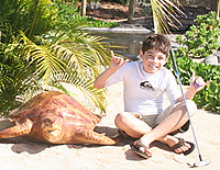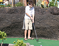 アロハ! オアフ島、カポレイ在住ライターの恵里子です。先日、ウェット・アンド・ワイルド・ハワイ(旧ハワイアン・ウオーターズ・アドベンチャー・パーク)で思いっきり弾けた我が家の仲良し(?)兄弟、スカイラー竜馬(12才)とハンター海斗(10才)が、またまたパークに戻ってきました〜! なんと今日はこのテーマ・パークのもうひとつのアトラクション、「アイランド・アドベンチャー・ゴルフ」に初挑戦します。 「アイランド・アドベンチャー・ゴルフ」は、ウェット・アンド・ワイルド・ハワイのゲートの右横にあり、パークとは入り口も料金も別。私たちはクーポン券持参で子供1人$7を支払い、ゴルフクラブとボールをレンタル。緑と青のゴルフクラブを片手に、「今日の勝負は僕の勝ちだな!」と言い合いを始めた竜馬と海斗ですが、実は2人とももっぱらゴルフは完全「インドア」派。打ちっぱなしではなく「任天堂Wi」ゲームでやるゴルフ・マッチ(苦笑)!? そんな2人も今日は青空の下で元気一杯プレイするぞ〜。 |