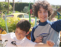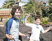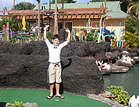 アロハ! ハワイの歩き方編集部の恵里子です。さて、オアフ島カポレイにある水のテーマパーク、ウェット・アンド・ワイルド・ハワイに隣接する「アイランド・アドベンチャー・ゴルフ」でパターゴルフをしにやってきた我が息子たち。前回に引き続き、ハワイ気分満点のアトラクションについて語りますよ〜。 このミニチュア・ゴルフのコースですが、18ホールという広さは最高ですね。最初、ゴルフ場に付いた時、兄の竜馬の姿が一瞬見えなくなったかと思ったら、コース中を駆け回って探検していたらしいです。戻ってくるなり「広いね〜」と一言。 でも、それよりもっと「各ホールに仕掛けてある障害物がポイント」と2人とも口を揃えて言っています。「その障害物は各ロケーションに合わせて、ロック(石)やサーフボード、ティキ像だったりするのが珍しくて面白いんだよ。そして障害物もだんだんと難しくなってきて、もちろん最後が一番難しいけどね。プレー自体よりもどうやって障害物に対抗するか、のほうが断然面白いよ」と兄の竜馬君のご意見。 「僕はトロピカルな景色や雰囲気が良かった。一番のお気に入りはケーブ(洞窟)とウォーターフォール(滝)だね!」と弟の海斗。私も初めて行った感想は、「シチュエーションが凄く楽しくて家族揃って楽しめる場所」ですね。小さいお子さんも十分楽しめます。どちらかというと小さい子の方がもっと楽しめるかも。あっ、ところで肝心の勝負の方は、兄の竜馬1ポイント差で勝ち、でした。 |
